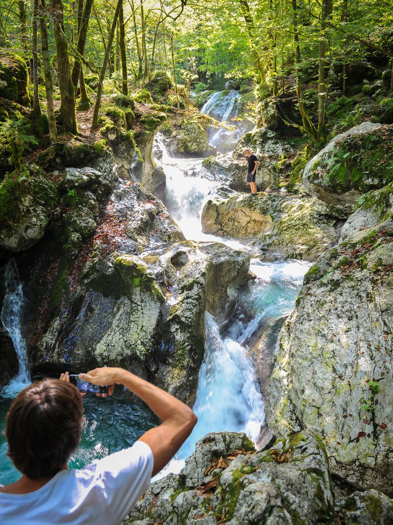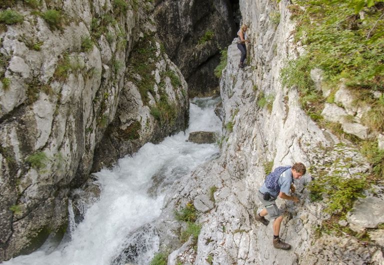 Die Quelle der Soča liegt im Trenta-Tal, unweit der Hauptstraße, die zum Vršič-Pass hinaufführt. Die Gewässer, die von den Berggipfeln der Julischen Alpen hinabfließen, sprudeln aus einer Höhle mit einem unterirdischen See zu Tage. Die enge Schlucht breitet sich bald aus und begleitet den lebhaften Fluss Soča auf seiner 138 km langen Reise bis zu seiner Mündung in Italien. Die Quelle ist eine wundervolle, allerdings etwas schwerer zugängliche Naturattraktion, die zur Besichtigung ein wenig Geschick benötigt. Auf dem angelegten Fußweg benötigen Sie etwa 15 Minuten. Am Anfang ist der Weg anspruchslos, im letzten Teil wird er jedoch steiler und ist in den anspruchsvolleren Passagen mit Stahlseilen gesichert. Wir empfehlen gutes Schuhwerk.