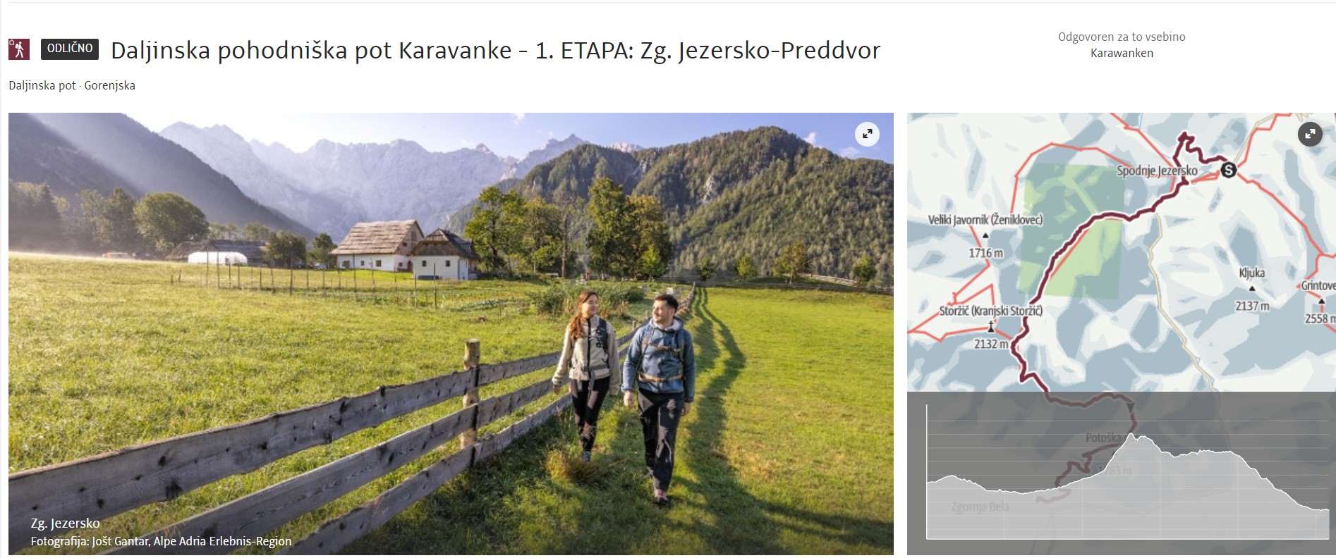 The trail starts (or ends) in Zgornje Jezersko and takes you past the Old Church of St. Ožbolt, where you can enjoy a view of the Kamnik-Savinja Alps. Continue along the right bank of the Kokra River and later over the valleys and eastern slopes of Storžič to Bašeljsko sedlo pass. From the pass, descend via Hudičev Boršt’ along the scenic trails to Preddvor.