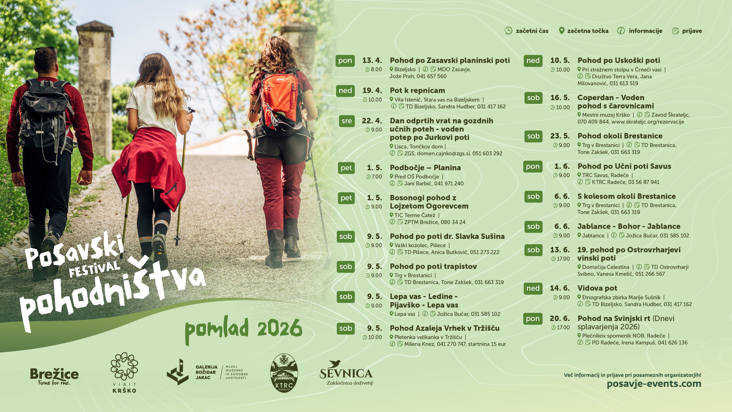 Posavski festival pohodništva – pomlad 2026 vabi vse ljubitelje narave, gibanja in odkrivanja lokalnih posebnosti, da se pridružijo edinstvenemu doživetju v srcu Posavja. Festival združuje raznolike tematske pohode, ki potekajo po slikovitih poteh regije in so primerni za vse generacije – od družin z otroki do izkušenih pohodnikov.